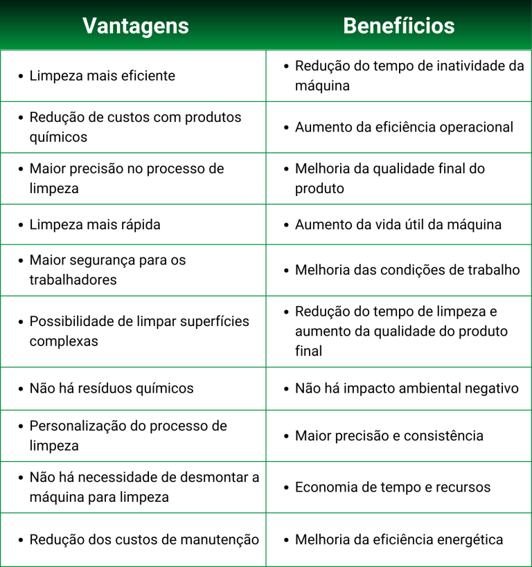 - Não é necessário utilizar fluido de limpeza química, tornando-o seguro e ecológico, além de não utilizar consumíveis.